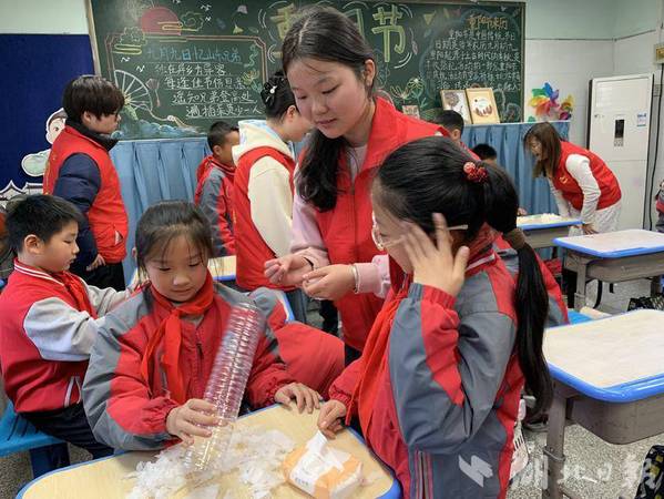活动前,志愿者们精心筹备实验材料,针对两个班级分别设计了“生活中的扩散现象”“伯努利原理的奇妙世界”两大趣味实验。在“红墨水扩散”实验现场,志愿者通过情景导入引导同学们思考“为什么墨水会让水变色”,随后带领大家分组操作,观察红墨水在不同温度水中的扩散速度。“原来饭菜飘香、花香四溢都是扩散现象!”401班的彭于晏看着杯中逐渐变红的清水,兴奋地和同桌分享,“这个实验让我发现,科学就藏在我们身边。”