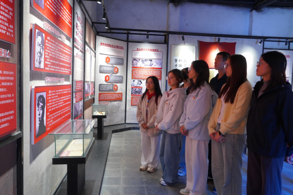 曹家晚村红色教育展馆内,一件件饱经沧桑的革命文物与一张张珍贵的历史照片,无声诉说着这片土地的红色记忆。大家认真聆听村委会办公室负责人的讲解,深入了解该村党组织创建的光辉历程以及在新时代推进乡村治理的实践成果。通过现场学习,师生们深刻体会到基层党组织在推动乡村振兴中所发挥的重要作用。随后,在鲜红党旗前,全体师生党员庄严举起右拳,铿锵有力地重温入党誓词,进一步增强了党员意识和历史使命感。