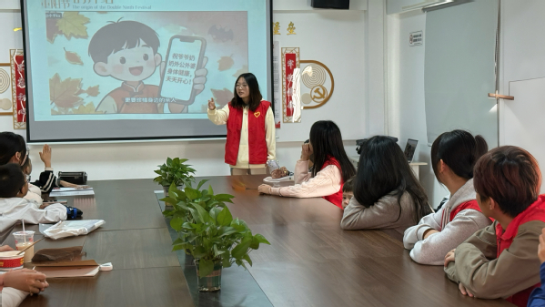 在主题宣讲环节,汉语言文学2402班的石灵玉同学借助生动有趣的图文,为孩子们讲解了重阳节登高、佩茱萸、赏菊等传统习俗,并阐释了其中蕴含的“敬老慈幼”文化内涵。“重阳不仅是一个节日,更是一份亲情的唤醒、一次陪伴的提醒”,她结合现实生活,引导孩子们理解关爱长辈、珍惜团聚的重要意义。