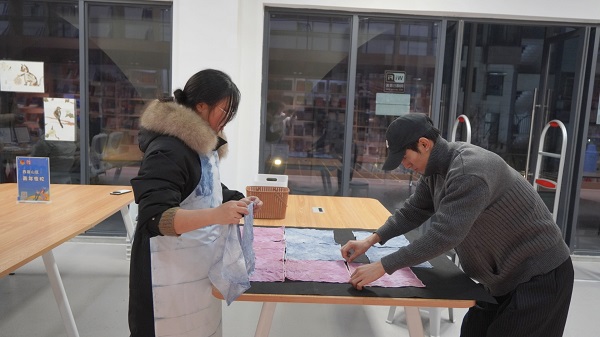 互动环节为扎染创作。青年们手持白布,灵活运用折叠、捆绑、夹扎等技巧,勾勒独特纹样,成功染制出蓝、粉两色兼具个性与美感的植物染作品。随后,大家将染好的布料加工成冰箱贴、发夹、编绳等实用文创产品,部分创意突出的作品还获得了现场观众的一致好评。活动尾声,参与者结合作品创意、工艺完成度投票选出优秀作品,获奖者收获植物染装饰画奖励。