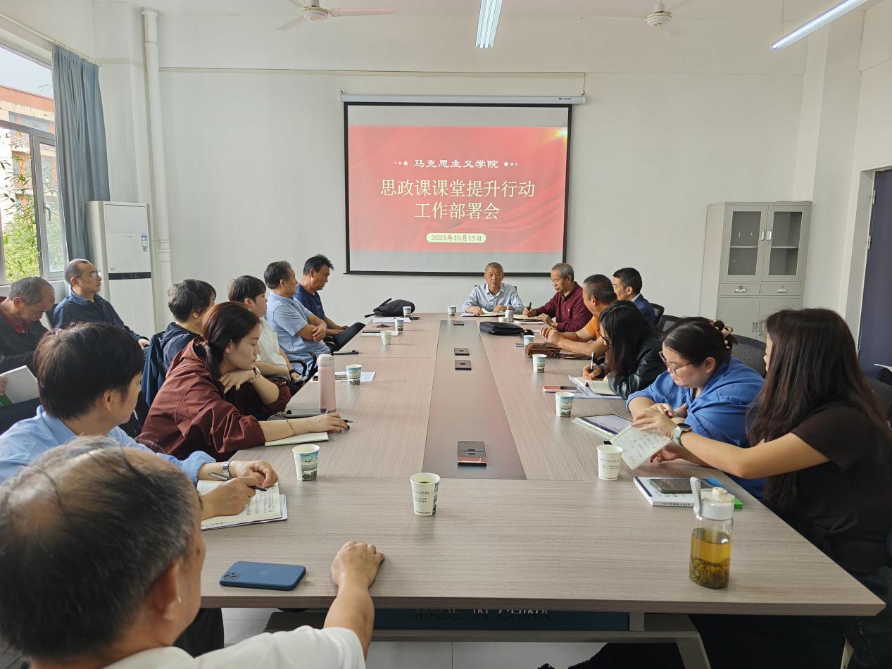 为了提升教学质量,落实《教育部办公厅关于开展2025-2026学年高校思政课课堂教学提升行动的通知》的工作要求,马克思主义学院于2025年10月15日上午,在3号实验楼208会议室召开专题部署会,学院全体教职工参加,院长周青山主持会议。