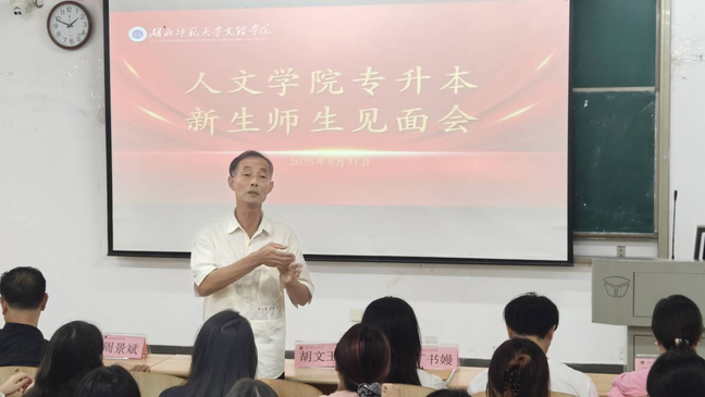 下午15时,人文学院专场专升本新生师生见面会如期举行。会上,人文学院院长熊子延围绕专升本学习情况展开详细介绍,着重强调“专心、静心、恒心”的学习态度,为新生明确学业方向、细化成长要求;人文学院党总支书记周景斌向新生致以热烈欢迎,送上“梦想成真”的祝福,并从珍惜学习机遇、恪守校规校纪、做好全方位安全防护(含政治安全、人身财产、交通及反诈防诈)、团结互助共进步四个维度提出期望,助力新生快速适应校园生活。