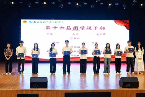 在第十七届团学联干部任职仪式中,新老两届成员一起走上台。由第十六届干部亲手为第十七届的干部们佩戴工作证,这不仅是一场“交接礼”,更是一场“接力跑”,这是责任的传承,也是使命的延续。