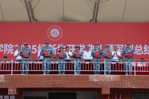 副校长王胜国宣读2025级新生军训表彰文件,校领导为本次军训过程中产生的优秀个人、团体及优秀辅导员颁奖。
