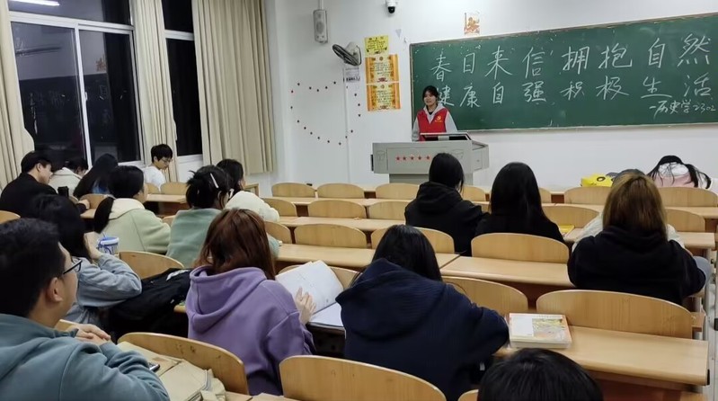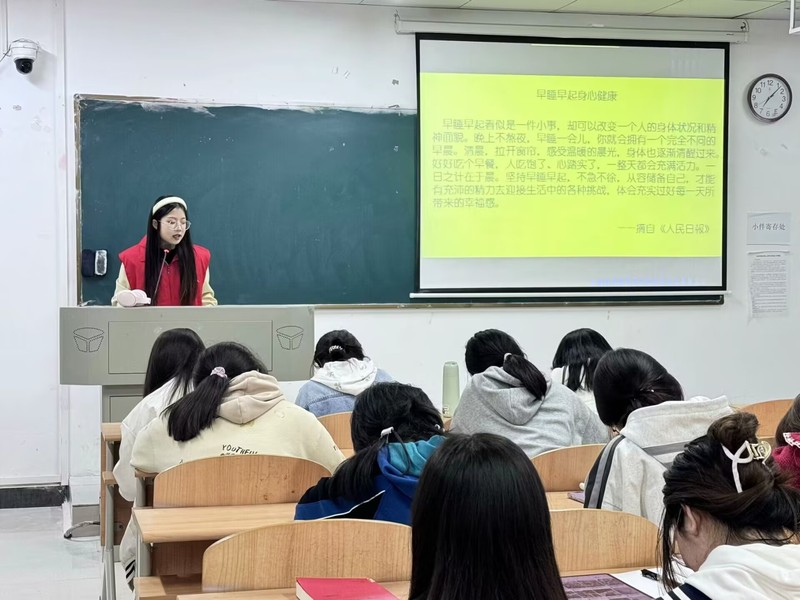 学生党员覃如苗在历史学2301班宣讲时谈到:“持之以恒地保持规律的作息对身体健康非常重要,需要进行自我调整并建立健康的作息。”她与同学们进行了贴心的交流,提醒大家加强身体锻炼,多出门亲近大自然并鼓励同学们努力学习,养成良好的生活习惯。通过党员同志的演讲,同学们也深刻意识到熬夜给自身带来的危害之大。