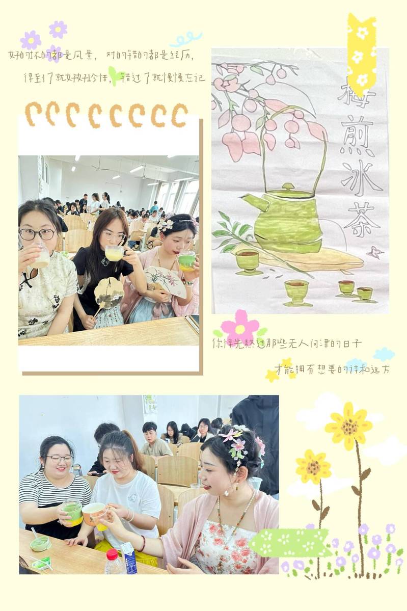 人文学部历史学2301、2302班于4月17日下午在教学楼2B304举办以“历”久弥新,与“史”同行为主题的教室快闪活动。活动分为自制与品尝宋代冰茶、diy掐丝珐琅画、爱国主义剧本杀(南京1937)、合唱《上春山》四个部分。