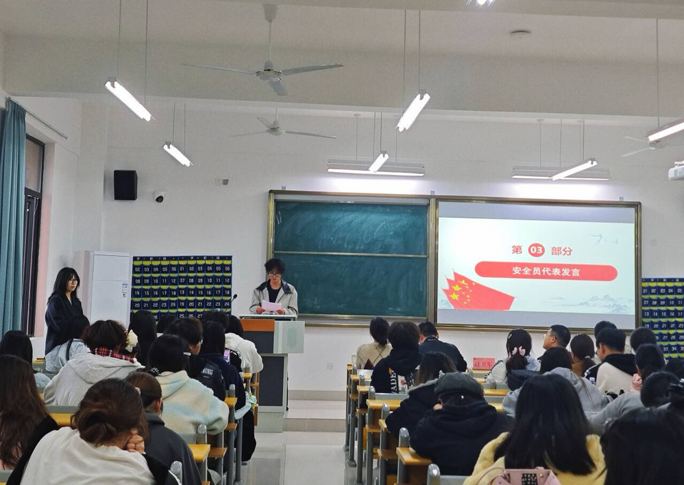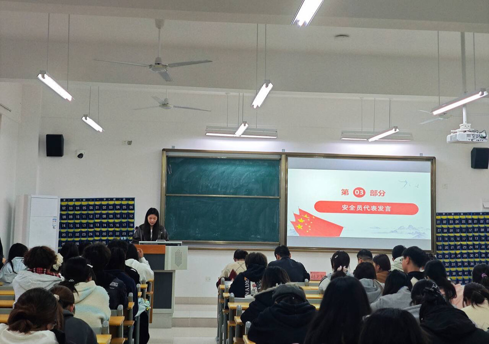 大会伊始,赵卫军书记发表致辞。他以贴近学生的日常小事为切入点,聚焦人身、财产、网络三大安全领域,围绕“安全”与“文明”两大核心,强调安全员队伍是守护学生校园生活的“第一道屏障”,文明班级是学院学风建设的重要载体。并号召全体师生以此次大会为契机,将文明意识融入日常言行、把安全责任落到实处,共同营造和谐、有序、安全的育人环境。随后,学工办负责人张一能对学院安全管理制度进行系统解读,重点聚焦《外国语学院学生宿舍文明养成规定(一二三四)》《外国语学院学生课堂文明“一听五不”诚信承诺书》《外国语学院学生法制安全公约(共计18条)》三大核心文件。他逐一梳理宿舍文明中“每周一查、作息二不、安全三防”等要求,课堂“认真听讲、五不行为”承诺及违约处罚措施,以及法制安全公约里离校请假、防盗防骗、防火用电等18条细则,同时明确辅导员、班长、寝室长的分级安全责任,为安全工作规范化开展提供清晰依据,助力师生精准掌握“守好安全防线”的具体路径。活动进入尾声,学生代表依次上台发言。英语2401班班长王爽爽结合班级日常管理经验,从学风建设、行为规范等角度,阐述了对文明班级创建的思考,并描绘了班级共同进步的美好期待。应用英语2501班生劳委员苏乐代表全体学生承诺,将积极响应学院号召,主动参与文明实践,配合安全员开展工作,以青春力量为校园文明与安全保驾护航。