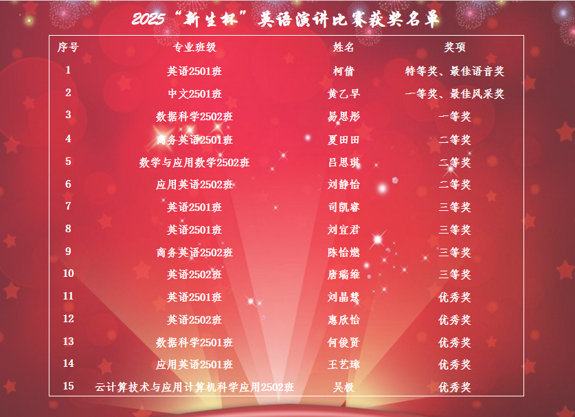 本次2025“新生杯”英语演讲比赛决赛获奖名单如下: