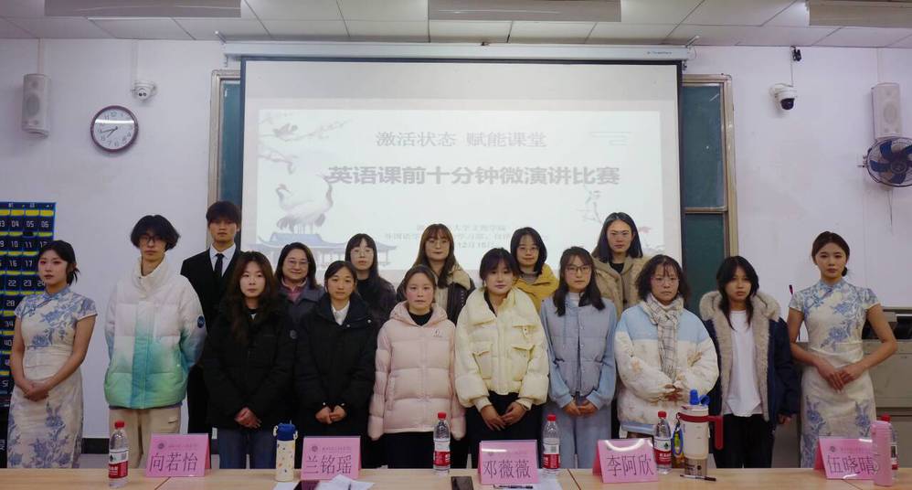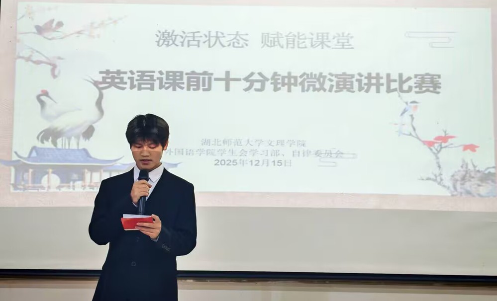 为学生搭建展示自我、锻炼能力的舞台,进一步激发课堂活力,厚植优良学风,2025年12月15日19时,MK网页版外国语学院在1B102教室举办“激活状态 赋能课堂”英语课前十分钟微演讲比赛。外国语学院英语专任教师兰铭瑶、邓薇薇、李阿欣、向若怡、伍晓晴担任评委,学院9名选手同台竞技、一展风采。