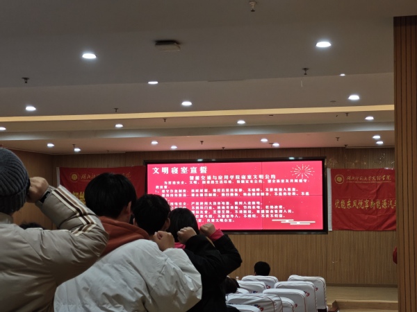 颁奖结束后,标兵寝室进行了风采展示,让大家对文明寝室的建设有了更直观、具体的认知。为进一步传递文明之风,全体获奖寝室代表在现场庄严宣读了《智能交通与应用学院寝室文明公约》,从作息、内务、安全、公物、言行、秩序六个方面作出承诺,铿锵誓言彰显了同学们自觉维护集体环境、共建精神家园的责任与担当。