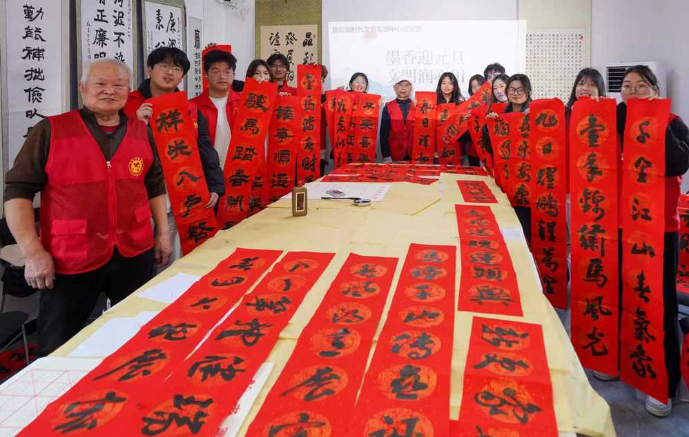 活动尾声,两位老师为每位学生精心创作了一副新春迎元旦主题对联,笔触间承载着对青年学子新年的美好祝愿。学生们手捧专属对联与老师合影留念,脸上洋溢着收获的喜悦。社区党委书记胡志刚表示:此次活动既传承了中华优秀传统文化,又丰富了大学生的精神文化生活,是新时代文明实践中心服务群众、凝聚人心的生动体现。