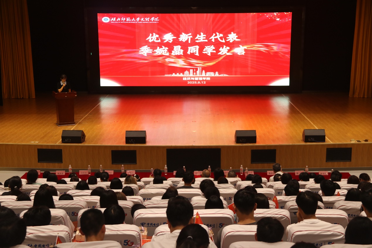 来自物流管理2301班的老生代表何信壹同学分享了自己在校期间的学习方法、实践经历与成长感悟,用真实案例为新生提供了实用的经验参考,鼓励学弟学妹们积极探索、勇于尝试。财务管理2501班的季婉晶作为优秀新生代表发言,她表达了对大学生活的憧憬与期待,并代表全体新生承诺将以饱满的热情投入学习,不负学院期望,努力成为优秀的经管学子。