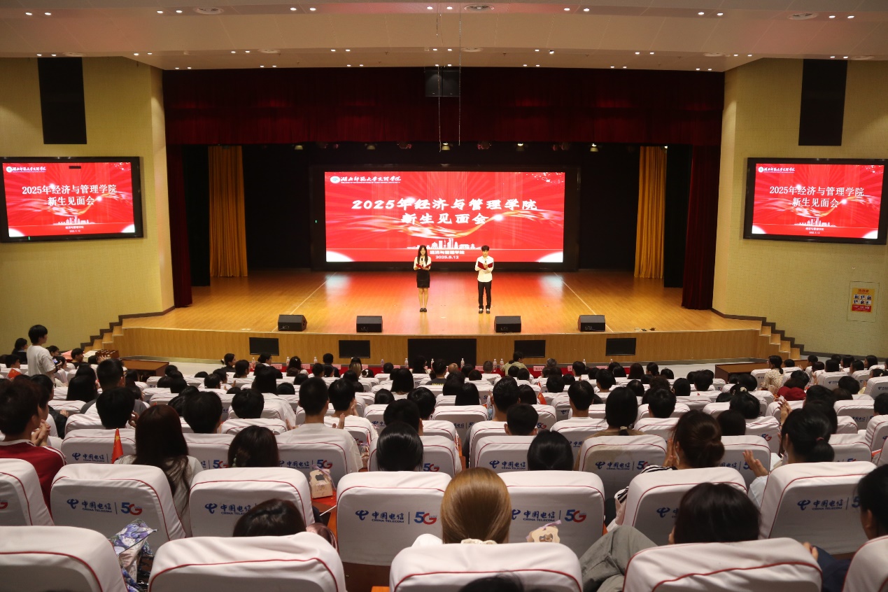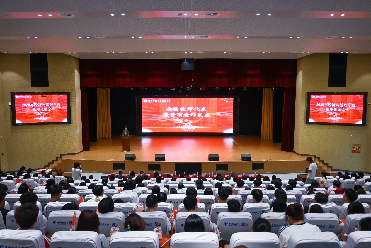 为助力新生快速适应大学生活,科学规划学业生涯,明确成长目标,切实感受学院关怀,9月12日下午14:30,经济与管理学院在学术交流中心隆重举行2025级新生师生见面会。经济与管理学院院长徐燕、党总支副书记罗铭、副院长胡景桂,专业负责人葛子明老师、鲁千霞老师、魏承钰老师、张锐老师,各专业任课教师、辅导员,以及全体2025级本专科新生共同参加了此次见面会。