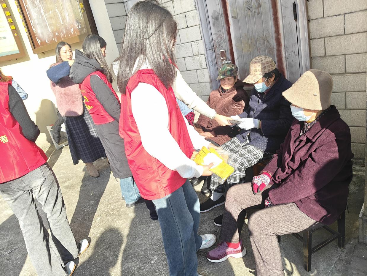 15:50,志愿者们走上社区街道,为坚守岗位的环卫工人们送上热水、贴有“感恩坚守”标签的护手霜与DIY的暖心手套,一句句暖心祝福、一份份贴心关怀,让户外工作者在寒风中感受到浓浓的暖意与尊重。