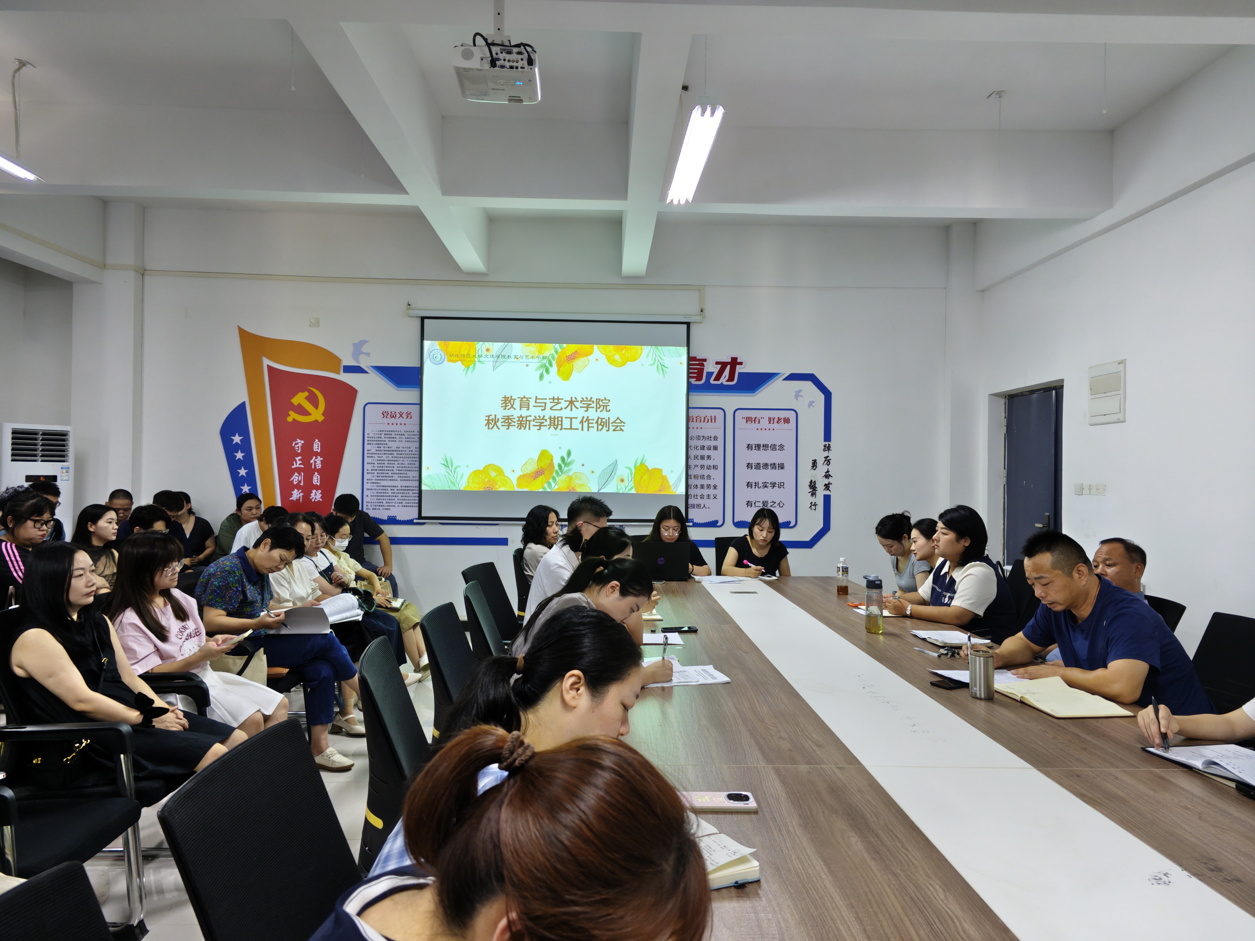 2025年8月29日下午3:00,教育与艺术学院在1号实验楼414会议室召开了全体教职工新学期工作会议,本次会议主要包括以下几个议程:1.新进教职工自我介绍;2.胡蕾院长就日常教学活动、学科竞赛、学科建设等工作进行了布置;3.陈小龙书记就我学院上半年在学生党建、学生日常工作方面进行了总结汇报,随后对本学期的重点工作进行了强调;4.王文院长首先就本年度学院招生情况进行了总结分析,希望老师们根据目前形势调整自身状态,更好的投入到工作中去。随后对提高教学质量、毕业论文、迎新及新生入学教育等工作进行了部署;5.各教研室开展教研活动,为新学期的工作做好准备。