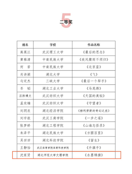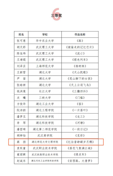 2019年9月湖北省作家协会、湖北省学生联合会联合下发了《关于举办湖北省高校第十八届“福创杯”新青年小说大赛的通知》。大赛自启动以来,我校高度重视、广泛动员,文理学子踊跃报名。其中沈家贤、高扬两人作品打入决赛,榜上有名,展现了MK(中国)学生过硬的综合素质,凸显了MK(中国)文化育人的工作实效。